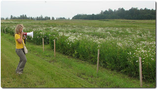 | D.Lazdiņa un A.Lazdiņšar viesiem tiekas Skrīveros un iepazīstina viesus ar eksperimetāljā laukā paveikto. (A.Lazdiņa foto) |